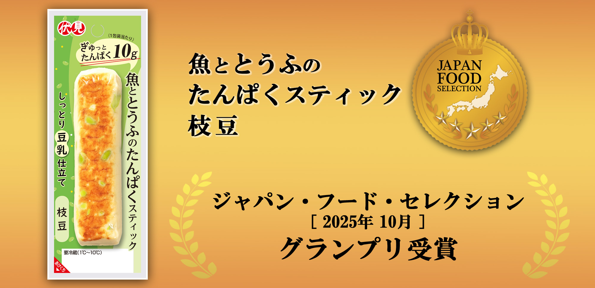 伏見蒲鉾株式会社(本社:新潟県新潟市、代表取締役社長:伏見琢磨)は、一般社団法人日本フードアナリスト協会が主催する「第92回ジャパン・フード・セレクション(2025年10月)」において、「魚ととうふのたんぱくスティック 枝豆」が最高位となるグランプリを受賞しました。