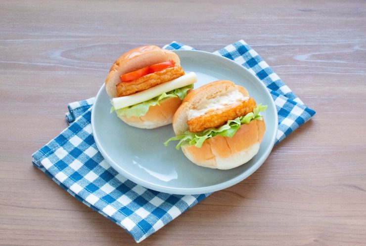 - ひとつはレタス、スライスチーズ、おさかなめんち揚、トマトをはさむ。